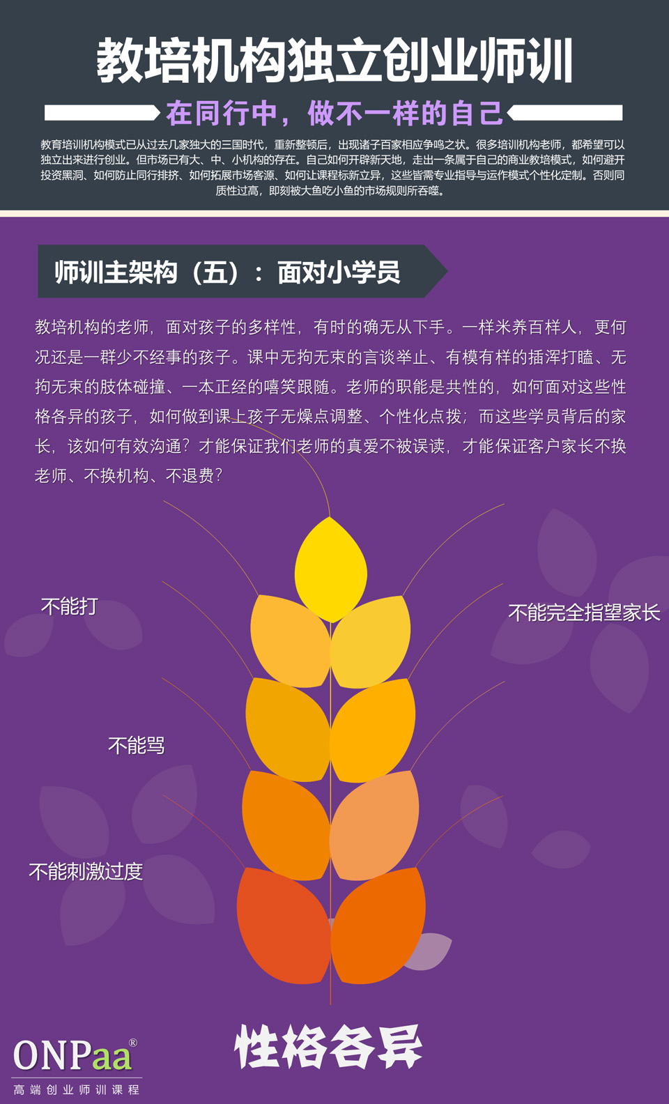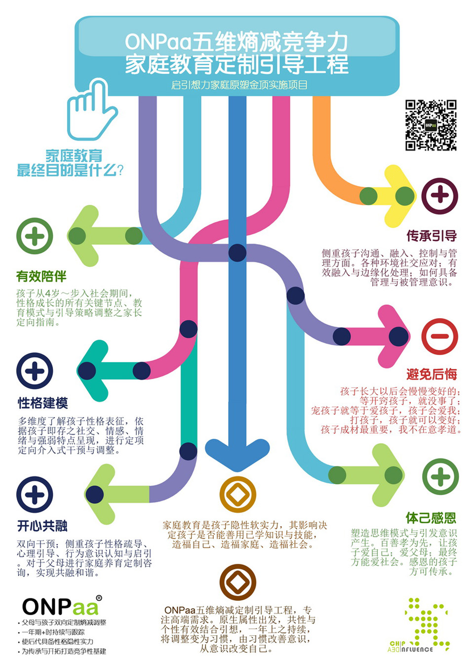 | 从“知道”到“做到”的家长。 家庭是一个系统,孩子的成长深深地打着家庭的烙印。父母的一言一行,一举一动,无时无刻不在影响着孩子。家庭的教育在潜移默化中影响着孩子对孩子的人生观,世界观尤其是性格的形成起到了至关重要的作用。 对孩子的启引教育,一定是越早知道,越早预防、越早规则、越早调整,越善! 欢迎走进ONPaa学院 - 父母家庭工作坊。 |
