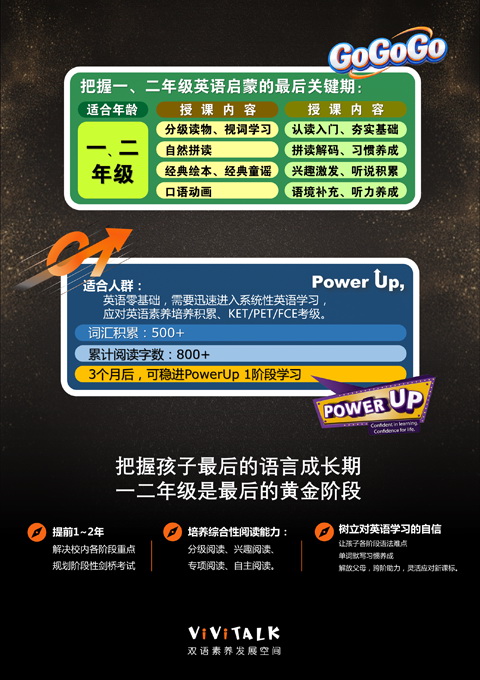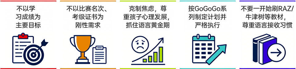 孩子一开始就要进入英语冲刺, 以下几点,请各位家长务必关注: 不以学习成绩为主要目标; 不以比赛名次、考级证书为刚性需求。 克制自己,切勿焦虑,只需要尊重孩子的心理发展,抓住现在的语言黄金期的最后阶段,孩子依然可以跟上。 按照GoGoGo系列程序,制定英语学习计划,并尽可能的严格执行。 不要一开始就刷RAZ或牛津树,或者直接对标PowerUP等教材,切勿图快、图狠、图准,要尊重孩子的语言接收心态与习惯。