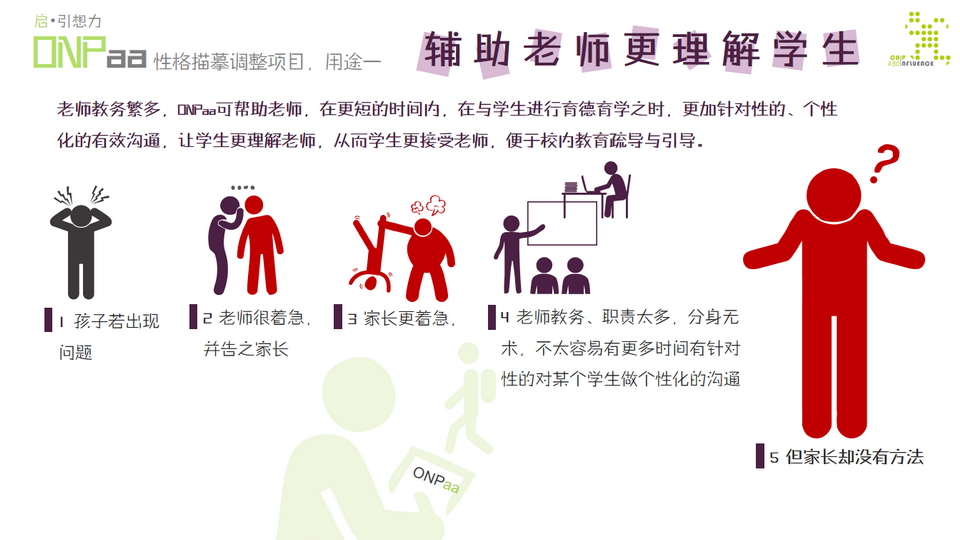 ONPaa可以运用行业技术手段,在有效的时间内,从孩子的情感心理与对话模式入手,找到此类学生的行为习惯、认知方式、逻辑模型与对话模式;从而辅助家庭与老师,运用有效的沟通方式,与此类学生达成共识,最终使学生积极接受引导或疏导。 此时有人会质疑:如果某位孩子不爱说话,过于害羞,内向,不愿沟通,该如何是好?ONPaa的对话沟通是否还有作用?