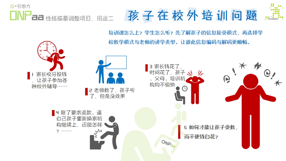 这种经过几年的家庭行为模式熏陶,孩子在自身性格塑造、心理状态、习惯养成与理解模式都已然开始自我塑形。 所以,如果需要对孩子进行更深层次的了解与理解! ONPaa工程的概念,于2014年,美国APA(心理学专家协会)提出,并由美国权威教育机构贝尔德文儿童教育中心针对少儿成长性格优化调整所采纳的主要辅配手段;意在生活中,全面渗透儿童社会性情感和行为养成教育,确保儿童获得亲近社会情感并为学业阶段奠定良好的行为习惯。2017年9月25日,美国已全面启动了CSS(学生性格描摹)评测,针对所有中学入学的学生,包括海外留学生。越来越多的国家,已开始意识到,在教育与文化影响方面,通过性格的个性化介入,能够更快速的达到引导与疏导的目的。