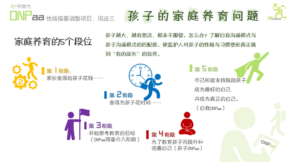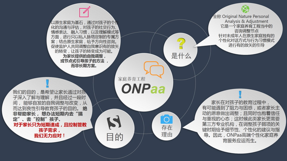 【2】什么是ONPaa? ONPaa,是Original Nature Personal Analysis & Adjustment的缩写,意思是“个人原生性格解析与调整”。 每位普通人,都是以个体的自然存在。每个人的独有社交、情感与理解模式,自TA出生,伴随着与生俱来(天生)的个性就开始与成长环境(家庭)进行磨合,并长期接受其影响。因此,自身的原生个性必然会受到一定的左右与倾向。在受原生家庭环境影响的同时,自身也同时建立起一套自认为可以与外界进行信息互换的行为模式与理解习惯,这就是所谓的ON(Original Nature)。